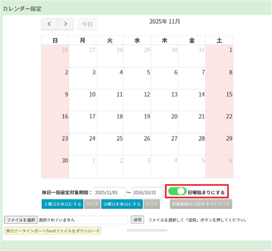 カレンダー設定画面に『日曜始まりにする』チェックが追加されました。