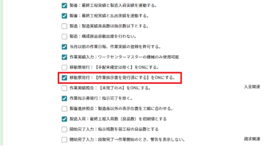 ONの時、移動票発行画面の「作業指示書発行済にする」チェックボックスがデフォルトでONになります。