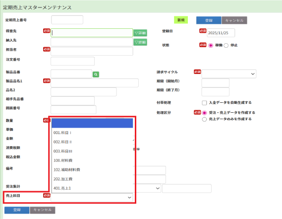 2. 定期売上マスターメンテナンス画面から、売上科目の設定ができるようになりました。