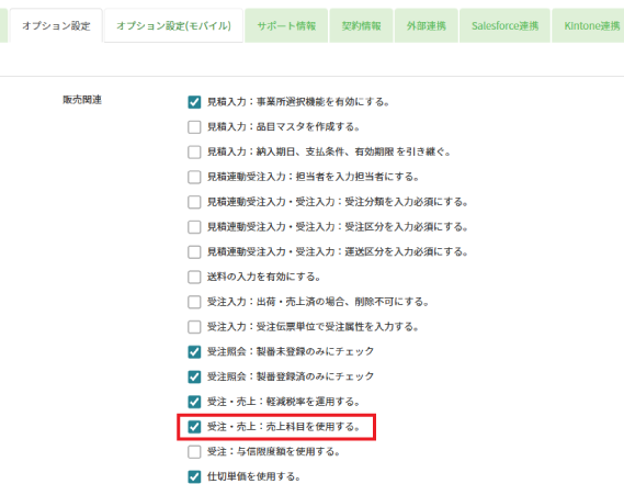 こちらの機能をご利用される場合、システム設定画面の【受注・売上:売上科目を使用する】をONにしてください。