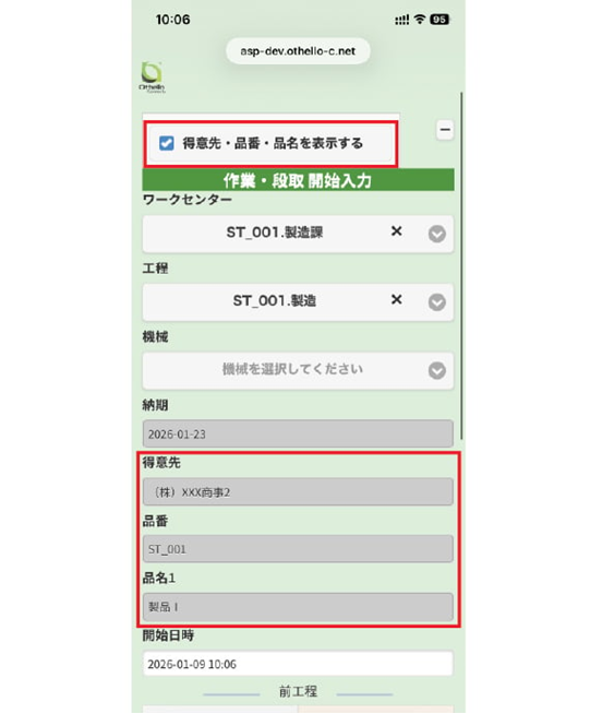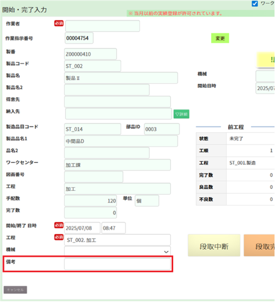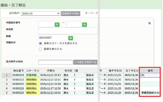 開始・完了入力画面と、開始・完了照会画面の表項目に『備考』が追加されました。 2026 1/23 アップデート 2026年1月22日 作業指示ガジェトユーザー様対象 1. 開始・完了入力画面と、開始・完了照会画面の表項目に『備考』が追加されました。 【画面の場所】メニュー > 作業 > 開始・完了入力 【画面の場所】メニュー > 作業 > 開始・完了照会 2. モバイル版の開始・完了入力画面に『得意先/品番/品名』が追加されました。 拡張機能のON/OFFで、表示/非表示の切り替えができます。 【画面の場所】メニュー > 開始・完了入力 アップデート