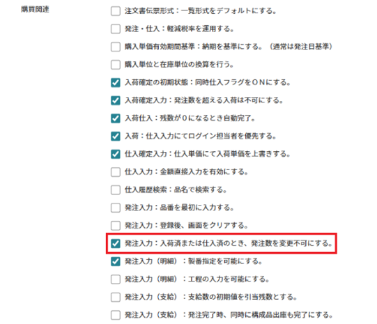 入荷済発注の発注数量の変更を不可にできるようになりました。