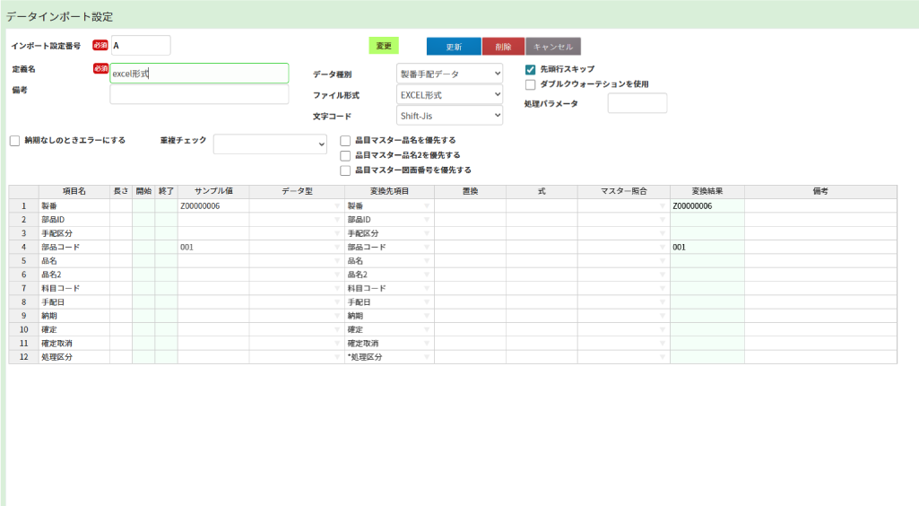 品目マスター品名を優先するチェックONの場合、製番手配データインポート(自由設定)画面にて、インポートするファイルの品名が空白でない場合でも品目マスターの品名をアップロードします。
