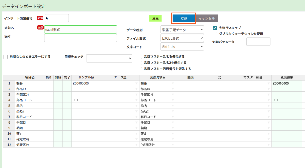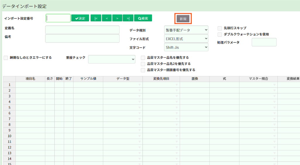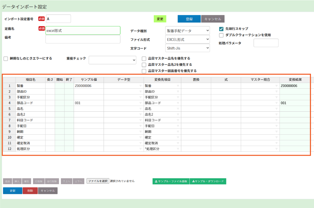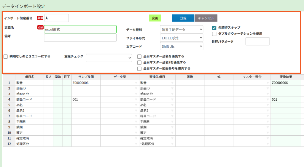 製番手配データインポート画面で、インポートするヘッダー項目を自由に設定できる機能です。
