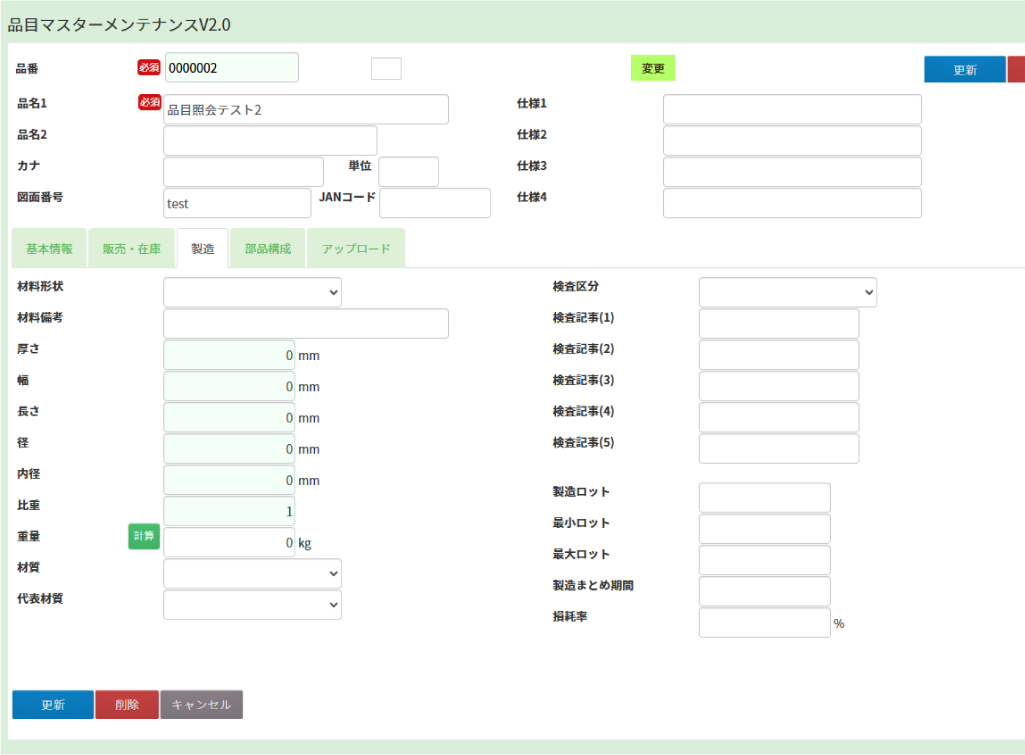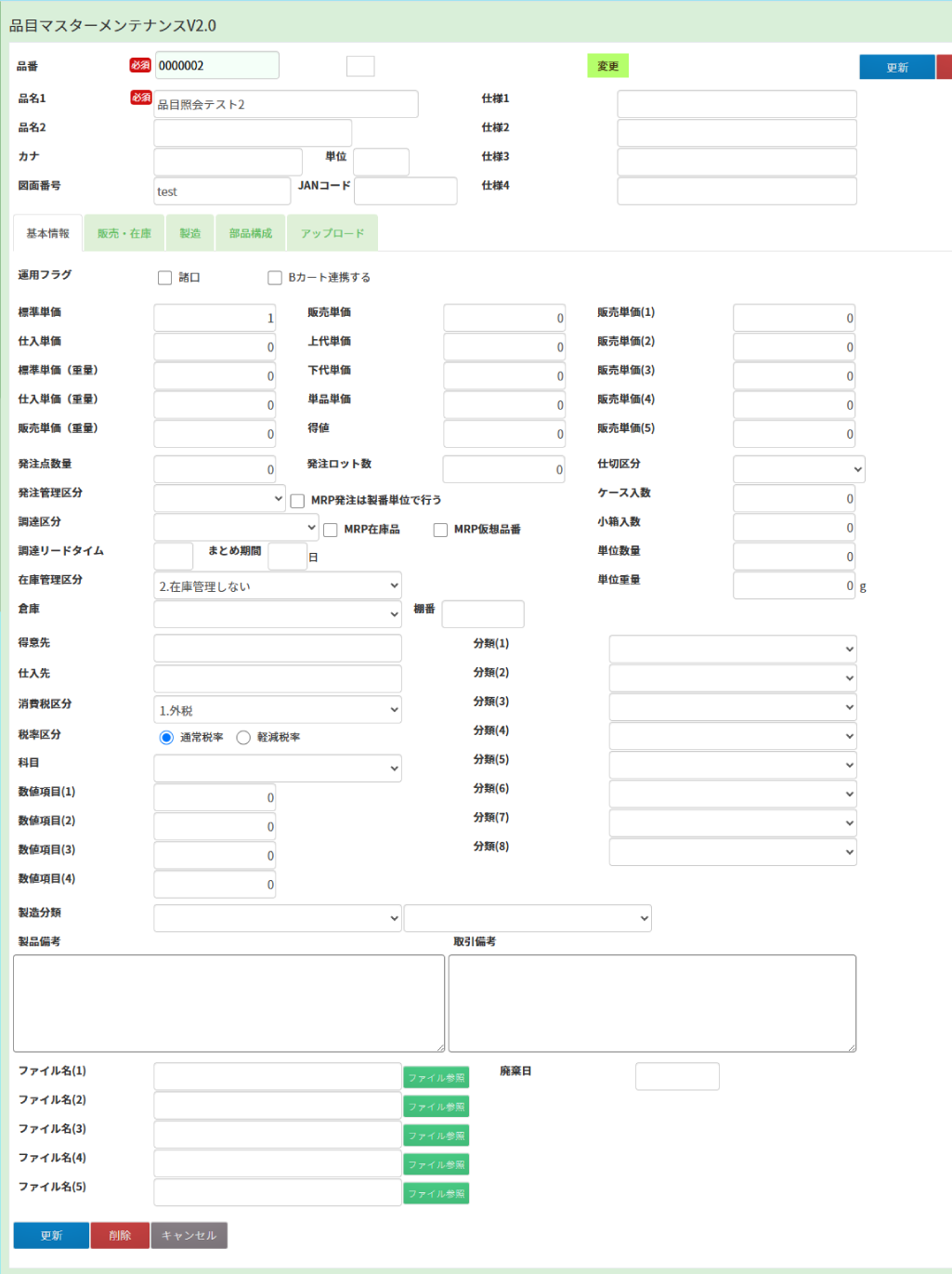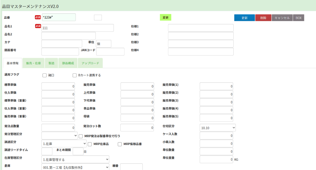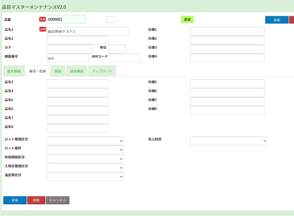 【画面の場所】メニュー > 基準情報管理(2) > 品目マスターメンテナンスV2.0