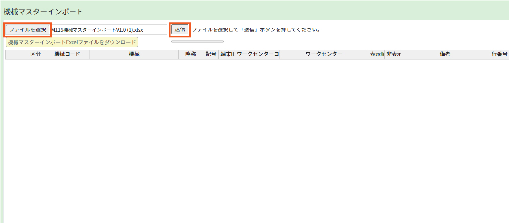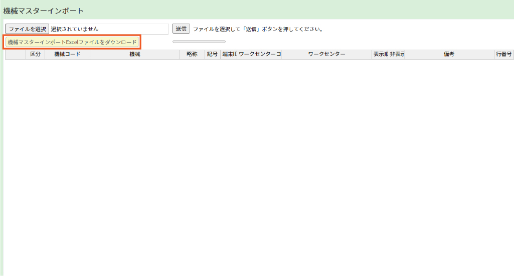 ① 機械マスターインポートExcelファイルをダウンロード ボタンをクリックします。