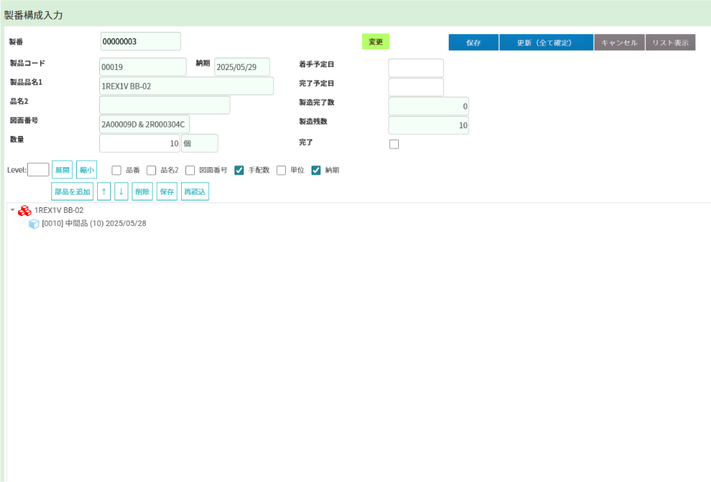 製番入力で登録したデータに対し、構成情報を追加する画面です。