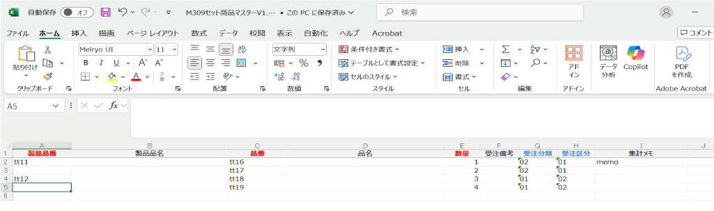 赤文字は必須項目となります。製品品番は、空白の場合上行の製品品番と同一になります。
